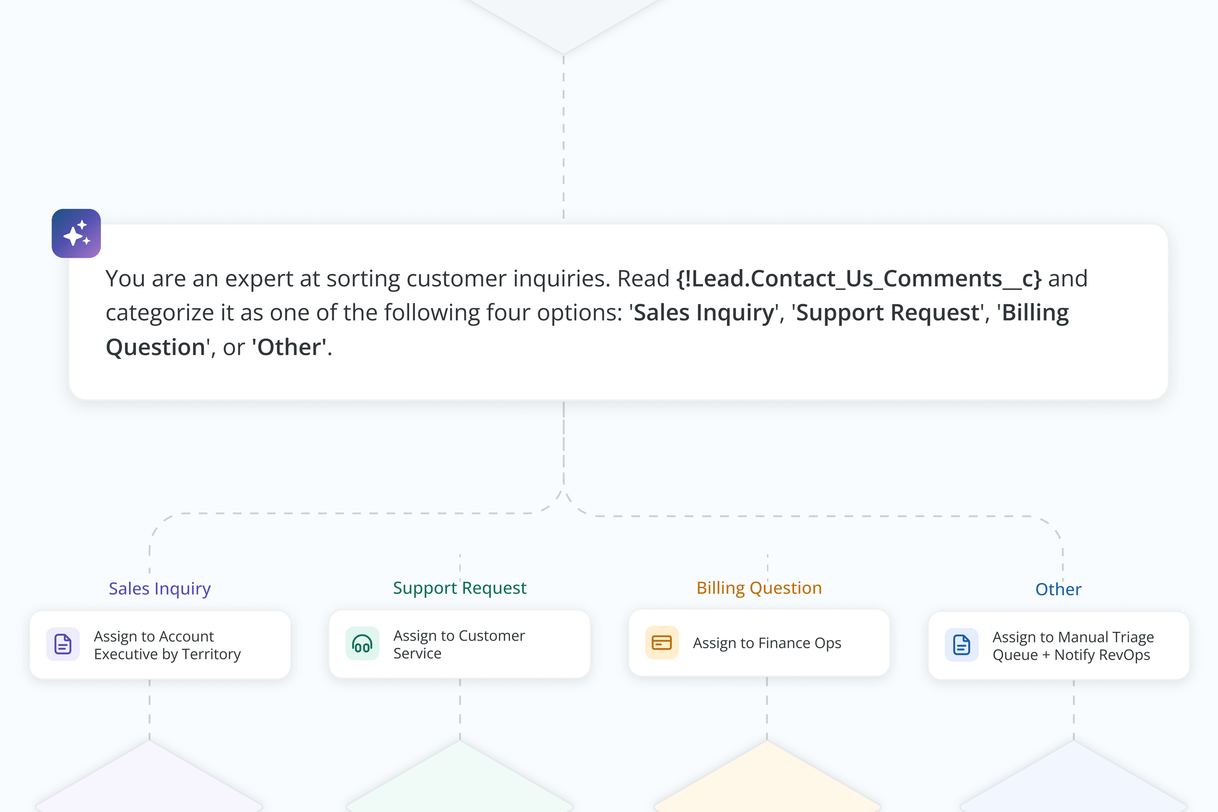 FlowBuilder’s first AI-powered node: enabling admins to turn free-form text into automated routing decisions, eliminating the manual triage that came before.